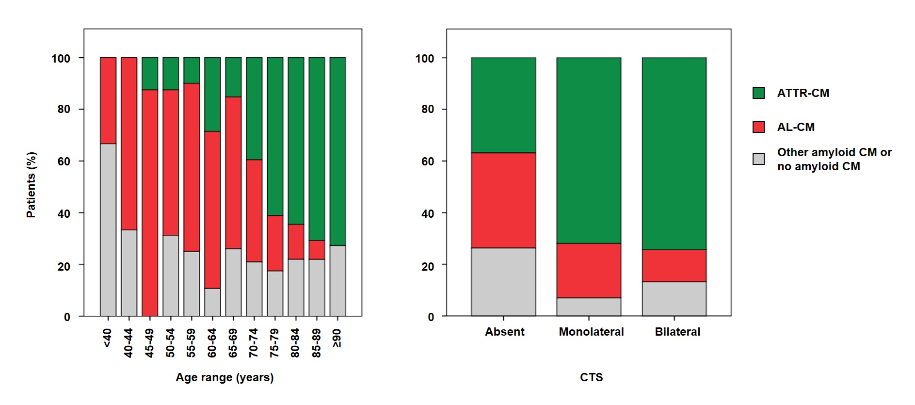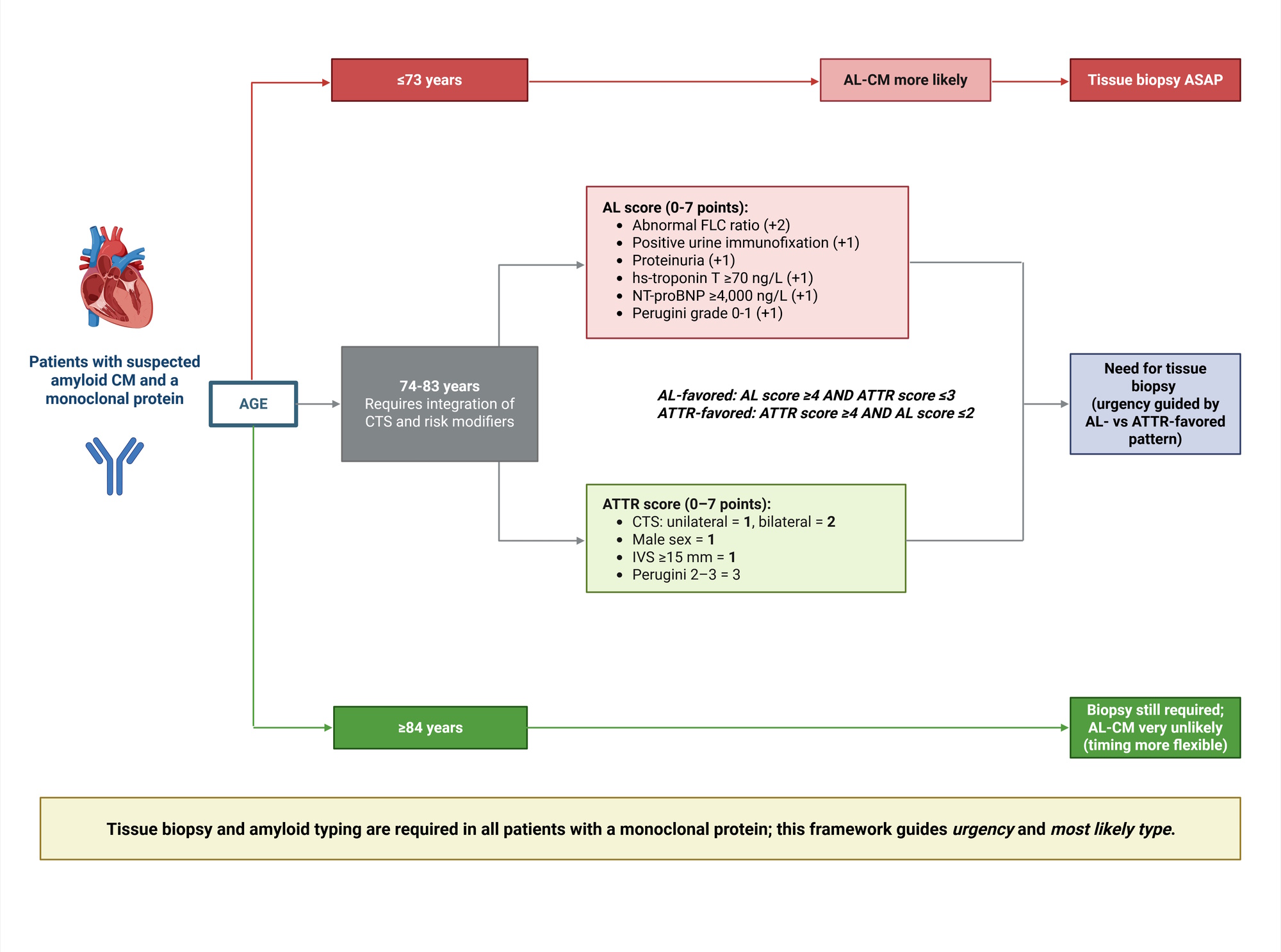 Background: In patients with suspected amyloid cardiomyopathy (CM) and a monoclonal protein, tissue biopsy is mandatory to exclude amyloid light-chain CM (AL-CM), the subtype requiring urgent therapy. We aimed to develop a pragmatic approach to estimate the most likely final diagnosis before biopsy. Methods: We studied a multicenter cohort of adults referred for biopsy because of suspected amyloid CM. Clinical, laboratory, ECG/echocardiographic and bone-tracer scintigraphy data were collected at initial suspicion. In patients with a monoclonal protein, we derived age cut-offs overall and by carpal tunnel syndrome (CTS), defined an age-based “gray zone” (74–83 years), and evaluated risk modifiers for AL-CM and transthyretin CM (ATTR-CM). We built a points-based algorithm for “gray-zone” patients. Clinical utility was assessed using decision-curve analysis. Results: Among 602 patients (median age 76 years; 81% male), 524 (87%) had a monoclonal protein. In the monoclonal-protein subgroup, ATTR-CM accounted for 49%, AL-CM for 30%, and neither ATTR- nor AL-CM for 21%. Age ≤73 years was the Youden-optimal threshold favoring AL-CM (sensitivity 66%, specificity 78%), whereas age >84 years made AL-CM unlikely (sensitivity 98%, negative predictive value 94%), defining a “gray zone” (n=261; ATTR-CM 63%, AL-CM 18%, no amyloid CM 20%). Within the gray zone, abnormal free light-chain ratio, positive urine immunofixation, proteinuria, and higher troponin T and N-terminal pro-B-type natriuretic peptide (NT-proBNP) favored AL-CM, while higher Perugini grade, male sex, greater interventricular septal thickness, and higher NT-proBNP favored ATTR-CM. Penalized models achieved cross-validated area under the curves of 0.87 (AL-CM) and 0.94 (ATTR-CM). A two-score algorithm identified small gray-zone subsets enriched for AL-CM (positive predictive value 81.5%, specificity 98%) or ATTR-CM (positive predictive value 95.2%, specificity 94%). DCA showed higher net benefit for score- and model-based strategies versus treat-all/treat-none across clinically relevant threshold probabilities, with consistent patterns across regions. Conclusions: In patients with suspected amyloid CM and a monoclonal protein, age- and CTS-anchored stratification refined by a compact set of routine laboratory and imaging features provides actionable pre-biopsy probabilities and may help prioritize urgent biopsy and AL-directed work-up while definitive tissue typing is pursued.