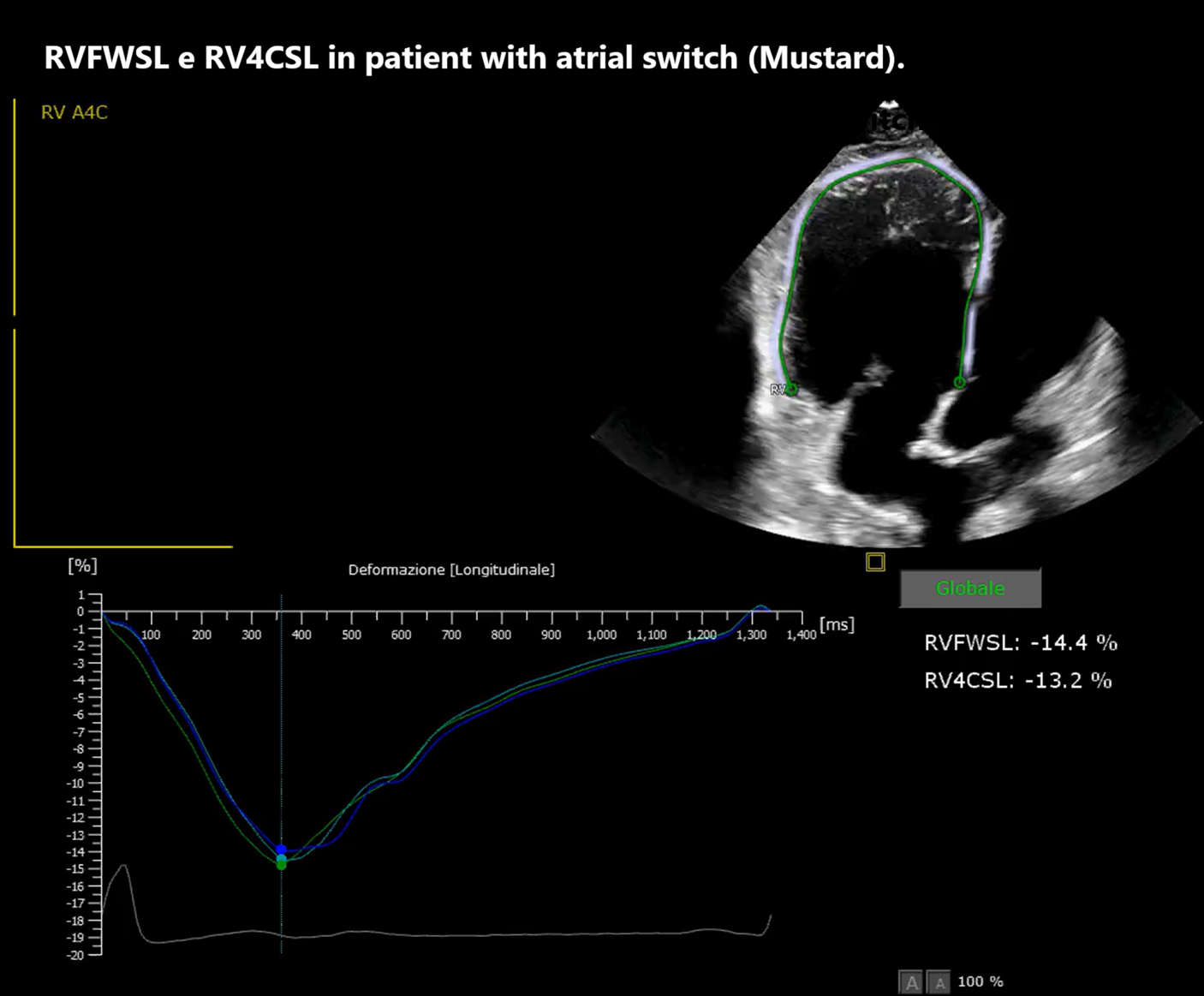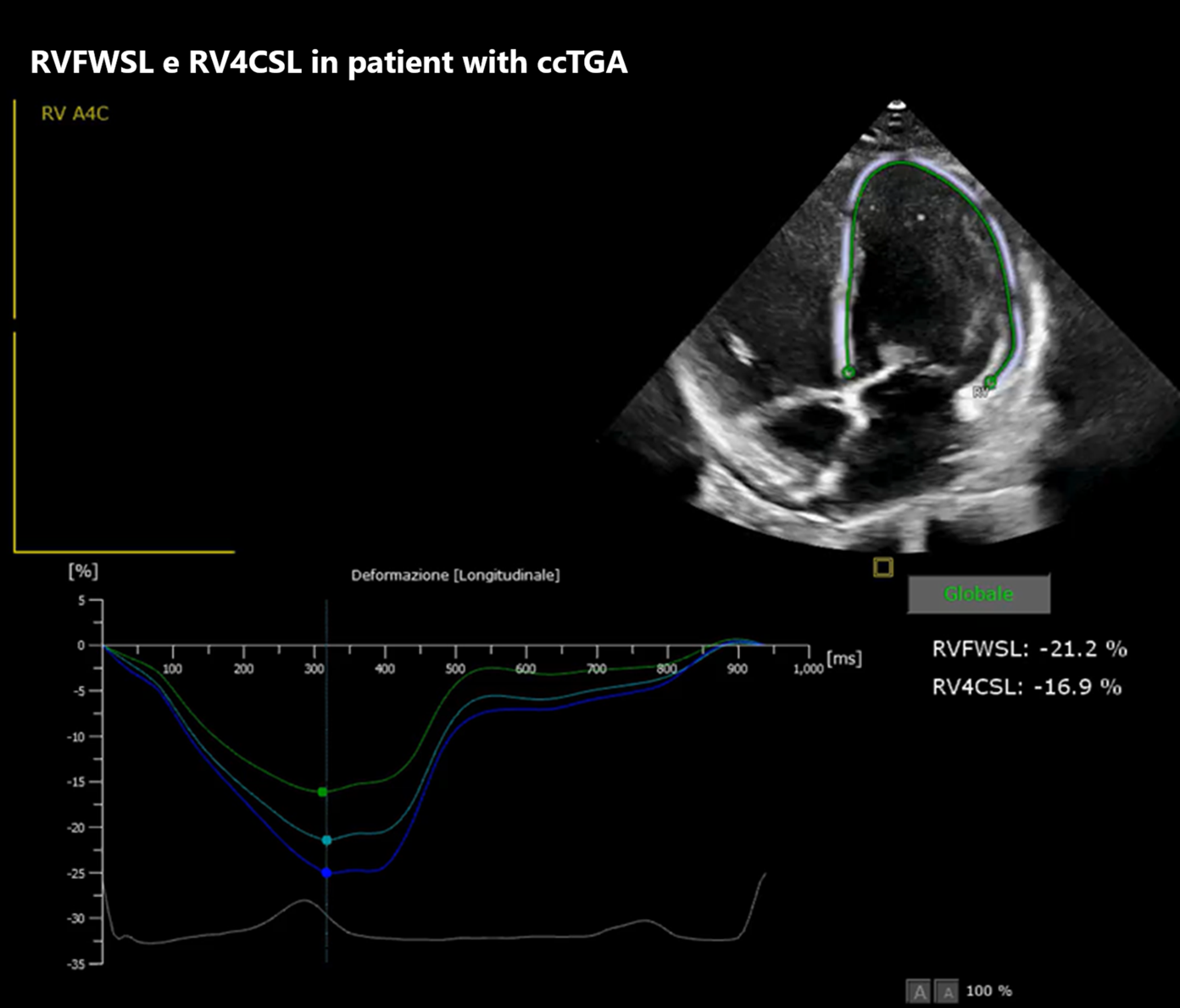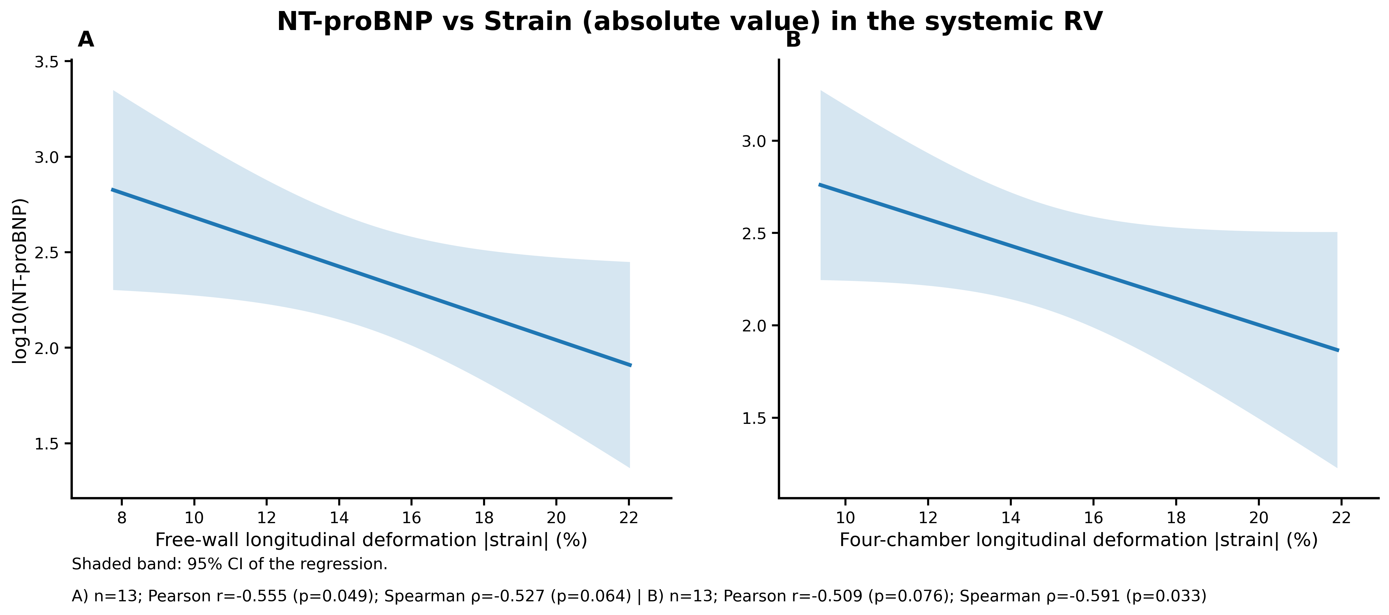 Background: The systemic right ventricle (sRV), present in patients with d-TGA after atrial switch and in congenitally corrected TGA (ccTGA), is chronically pressure-loaded, leading to ventricular remodeling and progressive dysfunction. In this setting, markers of myocardial mechanics and wall stress integrating imaging and biomarkers are useful. Aim: To evaluate the association between NT-proBNP and sRV longitudinal strain (four-chamber strain, RV4CSL, and free-wall strain, RVFWSL) and, secondarily, to describe its relationship with conventional echocardiographic indices (FAC, TAPSE, TDI S′) in a GUCH cohort with sRV in biventricular circulation (Mustard/Senning and ccTGA). Methods: Retrospective study of 20 patients followed at our Center (ARNAS Civico–Di Cristina, Pediatric Cardiology Unit). All underwent comprehensive clinical assessment with functional evaluation, laboratory testing, ECG/Holter and echocardiography; speckle-tracking strain was available in 13/20 patients. Associations were explored using linear models and Pearson correlation; NT-proBNP was also log-transformed (log10) and results were checked with Spearman as a sensitivity analysis for outliers. Results: In patients with complete echocardiographic strain and NT-proBNP data (n=13), RVFWSL was inversely associated with NT-proBNP (Pearson r=−0.555; p=0.049; Spearman ρ=−0.527; p=0.064), suggesting that reduced longitudinal deformation (less negative strain values) is accompanied by greater neurohormonal activation. RV4CSL also showed a consistent inverse association with NT-proBNP (Pearson r=−0.509; p=0.076; Spearman ρ=−0.591; p=0.033), with less negative RV4CSL values associated with higher NT-proBNP. As a complementary analysis, higher FAC was associated with higher absolute RV4CSL (r=0.624; p=0.023), whereas TAPSE and TDI S′ showed weaker but concordant associations. Conclusions: In our biventricular-circulation sRV cohort, higher NT-proBNP is associated with worse longitudinal mechanics, particularly at the free wall. Interpreted together, strain and NT-proBNP may help grade hemodynamic severity and guide follow-up; these exploratory findings require confirmation, using additional diagnostic modalities.