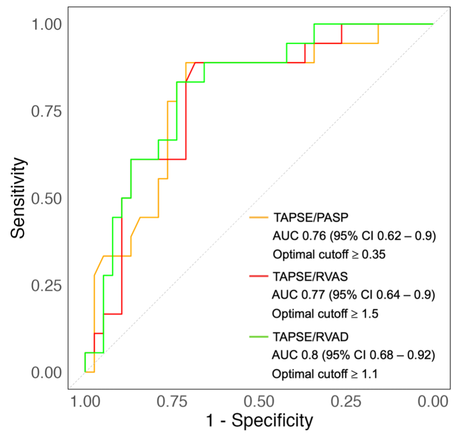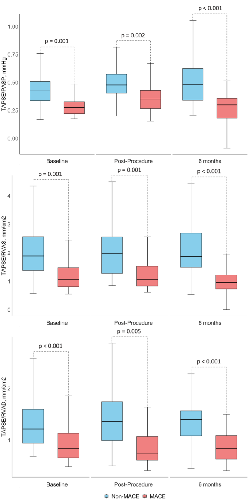 Background Mitral regurgitation (MR) is a prevalent valvular heart disease with poor outcome. Percutaneous mitral valve repair on top of guidelines-directed medical therapy has been associated with prognostic benefit. Yet, the percentage of patients who die or are re-hospitalized for heart failure, within the first year is high. Identification of these short-term non-responders to PMVR is of great clinical importance. Aims This study aims to assess the prognostic value of advanced right ventricular (RV) function parameters in predicting major adverse cardiovascular events (MACE) following percutaneous mitral valve repair using the MitraClip system. Methods This study analysed 60 consecutive patients with symptomatic severe MR who underwent percutaneous mitral valve repair . Echocardiographic assessments were performed at baseline, post-procedure before discharge, and at 6-month follow-up. Analysed echocardiographic parameters included tricuspid annular plane systolic excursion (TAPSE) normalized either to pulmonary artery systolic pressure (TAPSE/PASP), or to RV end-diastolic (TAPSE/RVAD) and end-systolic area (TAPSE/RVAS), and indices of RV myocardial work. MACE including all-cause death, heart failure hospitalization, and stroke, was assessed at one year of follow-up. Results A total of 35% of patients experienced MACE during the first year after percutaneous mitral valve repair . At baseline, patients with versus without MACE had significantly higher creatinine, troponin T, NT-proBNP and larger right heart size and lower TAPSE (all p < 0.05) while the remaining clinical, imaging and procedural characteristics were similar. In multivariate regression analysis, TAPSE/PASP, TAPSE/RVAS and TAPSE/RVAD were only significant imaging predictors of MACE (all p < 0.05). The AUC values using the multivariate models ranged from 0.80 to 0.85, indicating moderate to strong predictive capacity for these RV indices. Throughout the follow-up, these indices of RV function remained significantly lower in patients with versus without MACE (all p < 0.05). In contrast, parameters of RV myocardial work had significantly lower AUC (< 0.60) across all the time points. Conclusion The results of the present study suggest that the comprehensive assessment of the right ventricle can identify short-term non-responders to PMVR. The indices including TAPSE emerged as independent predictors of outcome while the indices based on RV myocardial work showed limited predictive power.