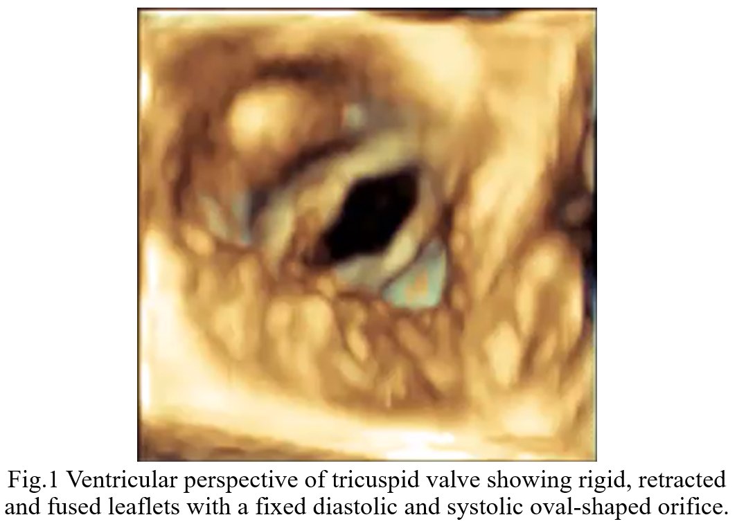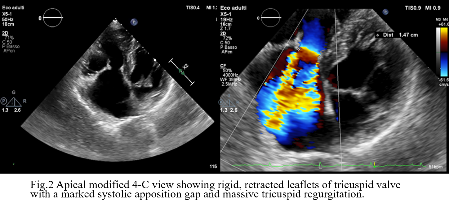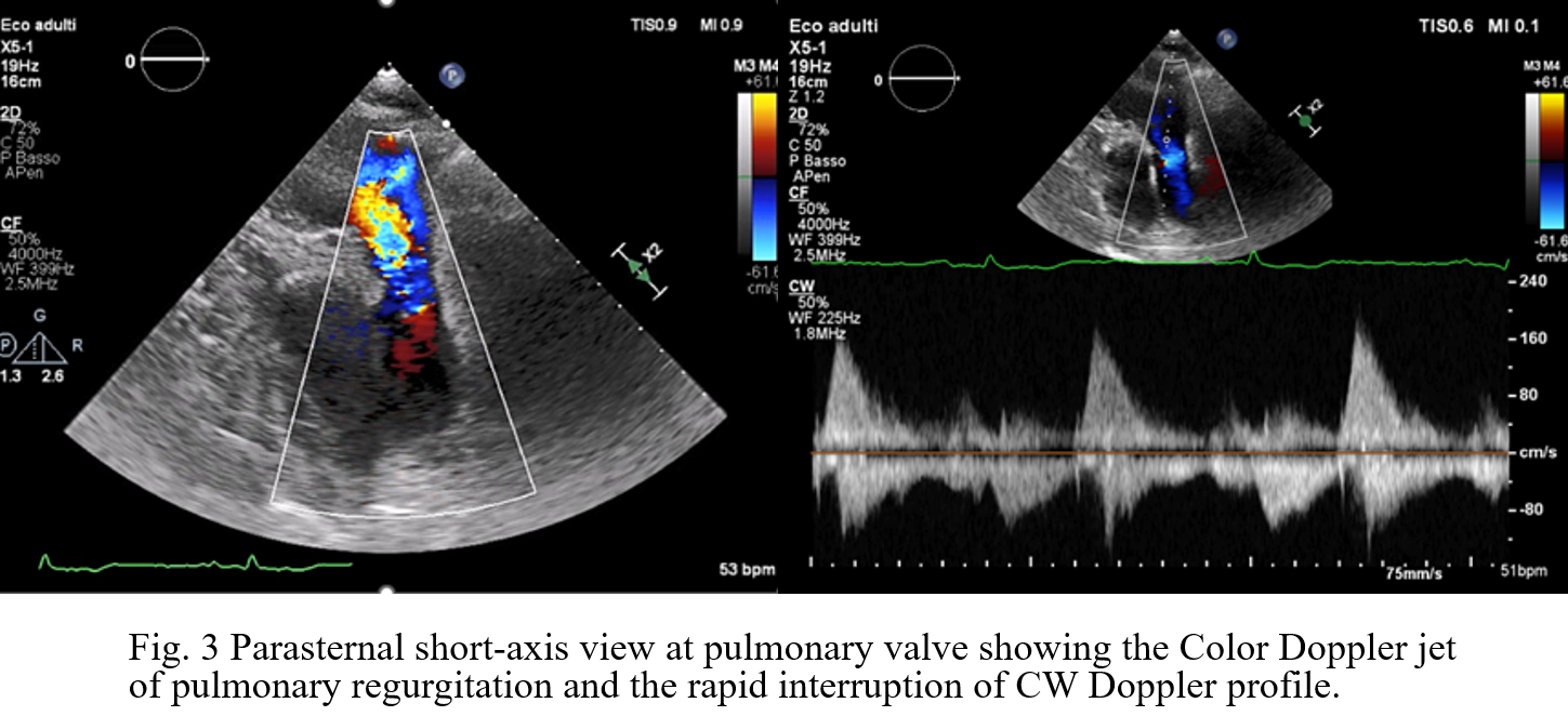 Background: Carcinoid Heart Disease (CHD) is a rare but ominous complication of neuroendocrine tumors (NETs), characterized by fibrotic plaque deposition on endocardial surfaces. While tricuspid valve involvement is well-documented, the pulmonary valve is often overlooked despite its significant impact on right ventricular (RV) hemodynamics. Case Presentation: A 73-year-old male with an ileal NET and liver/peritoneal metastases, stable under lanreotide acetate for four years, presented with progressive dyspnea and peripheral edema. Initial transthoracic echocardiography (TTE) and cardiac MRI identified severe tricuspid regurgitation (TR) and significant right heart dilation. The patient was referred to our Department to explore the feasibility of transcatheter tricuspid intervention. Advanced Imaging Findings: Comprehensive TTE and transesophageal echocardiography (TEE) confirmed RV dilation (RVD1 49 mm, RVOT 44 mm) with preserved systolic function (TAPSE 22 mm, FAC 48%). The tricuspid valve exhibited classic CHD features: fibrotic, retracted, and rigid leaflets with commissural fusion. 3D echocardiography showed a fixed, oval-shaped orifice (1.6 cm²) that remained immobile throughout the cardiac cycle due to systolic-diastolic mobility restriction (Fig.1). This resulted in massive TR (VC 16 mm, ERO 1.6 cm², dense triangular CW Doppler profile and systolic flow reversal in suprahepatic veins, Fig.2) combined with tricuspid stenosis (mean gradient 5 mmHg). Crucially, detailed evaluation of the pulmonary valve revealed retracted cusps. Diagnosis of pulmonary regurgitation (PR) was challenging at Color Doppler but a multiparametric assessment detected severe PR (dense CW Doppler with rapid interruption due to a rapid rise of RV diastolic pressures with pressure half-time of 80 msec and PR index of 0,62, Fig.3). Conclusion: These findings are pathognomonic for CHD, where vasoactive substances (e.g., serotonin) induce endocardial fibrosis. In this case, the complex anatomy of the tricuspid valve, combined with significant pulmonary valve involvement, rendered the patient unsuitable for transcatheter correction. This case emphasizes that the pulmonary valve must be rigorously evaluated in CHD, with a multiparametric approach, as its involvement is a critical determinant of surgical vs. percutaneous strategy. Management in this case must involve a multidisciplinary Heart Team to balance surgical risks against oncological prognosis.