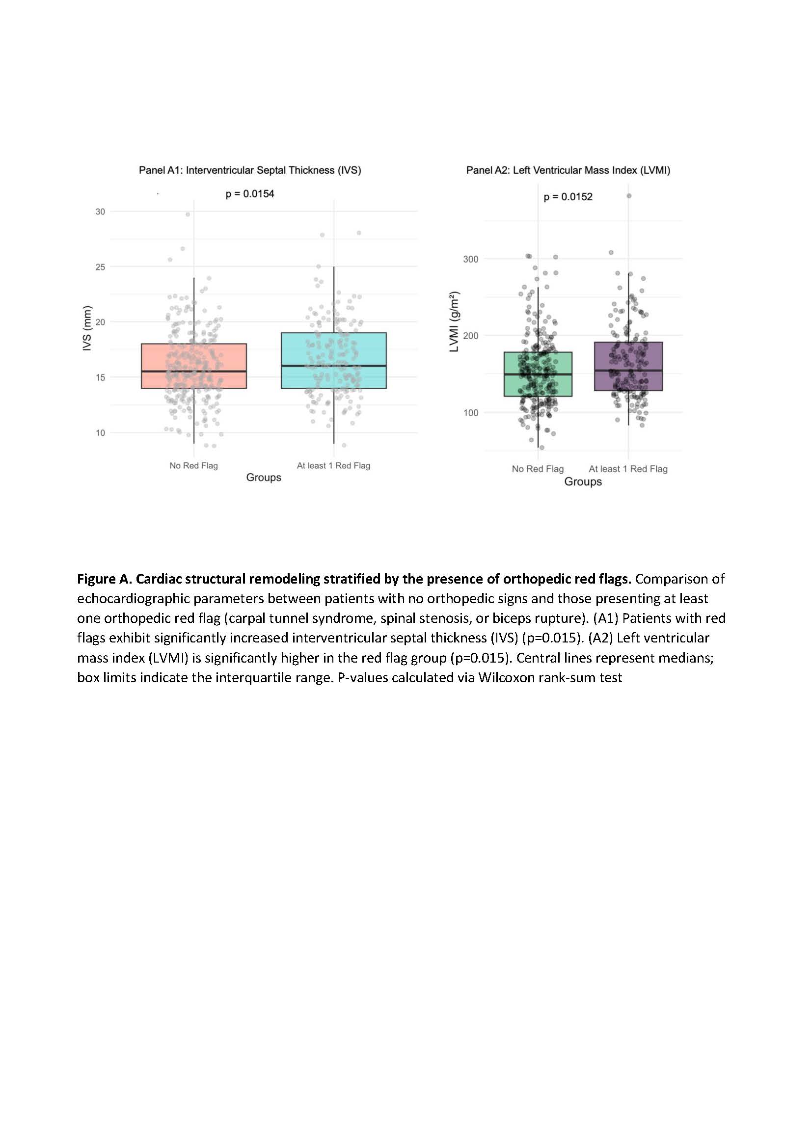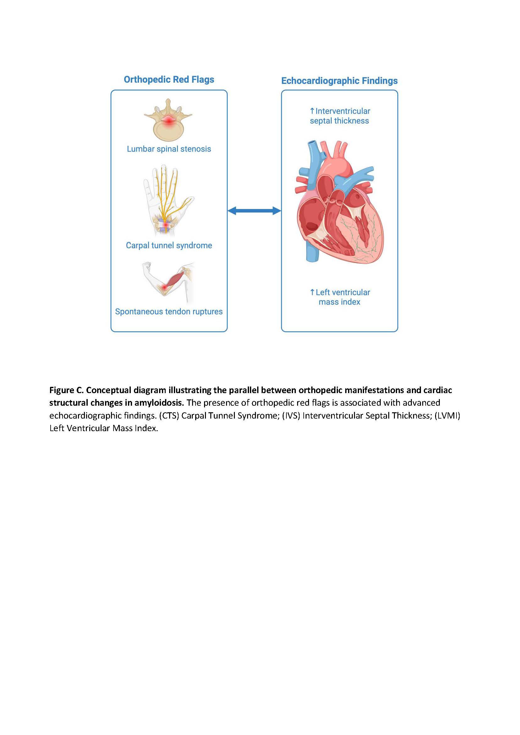 Background: Cardiac amyloidosis (CA) is a systemic infiltrative disease often associated with musculoskeletal manifestations. Orthopedic "red flags" include carpal tunnel syndrome (CTS), lumbar spinal stenosis, and spontaneous rupture of the distal biceps tendon. While their role in early suspicion is established, the association between the presence of these orthopedic signs and the severity of cardiac structural involvement at the time of diagnosis remains under investigation. Aim: The aim of this study was to evaluate the correlation between the presence of orthopedic red flags and echocardiographic markers, specifically interventricular septal thickness (IVS) and left ventricular mass index (LVMI). Methods: We retrospectively analyzed data from patients referred to our tertiary center for the diagnostic work-up and management of CA from 2018 to 2025. Medical history was collected and echocardiography was performed. We performed two analyses: (A) Comparing patients with "at least one orthopedic red flag" vs. "no red flags"; and (B) Comparing patients with "CTS" vs. "No CTS". Continuous variables were compared using the Wilcoxon rank-sum test. Results: We enrolled 551 patients (80% male, mean age 77 years) with confirmed ATTR (n=425), AL (n=122), ATTR+AL (n=2), and AA amyloidosis (n=2). The prevalence of orthopedic red flags was CTS in 170 patients (30.85%), distal biceps tendon rupture in 25 (4.54%), and spinal canal stenosis in 37 (6.72%). In Analysis A, in patients with at least one orthopedic manifestation, IVS was significantly higher in the red flag group (median: 16 [IQR: 5] vs. 15.5 [IQR: 4], p = 0.015), as was LVMI (median: 154 [IQR: 62.5] vs. 149 [IQR: 57], p = 0.015) compared to those without red flags. In Analysis B, patients with a history of CTS exhibited a significantly higher LVMI (median: 157 [IQR: 62.8] vs. 150 [IQR: 57], p = 0.038). The difference in IVS for the CTS group showed a trend toward increased thickness but did not reach statistical significance (median: 16 [IQR: 5] vs. 16 [IQR: 4], p = 0.065). Conclusions: Our data suggest that orthopedic red flags are not merely early warning signs but are associated with a more advanced cardiac phenotype. Patients with a history of orthopedic involvement present with significantly greater IVS and LVMI. This correlation implies that the systemic burden of amyloid deposition in the musculoskeletal system may parallel the magnitude of myocardial infiltration (Figure C).