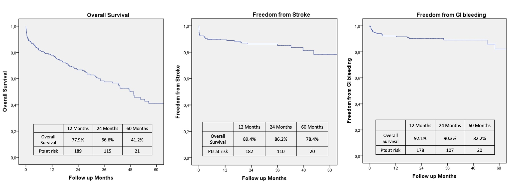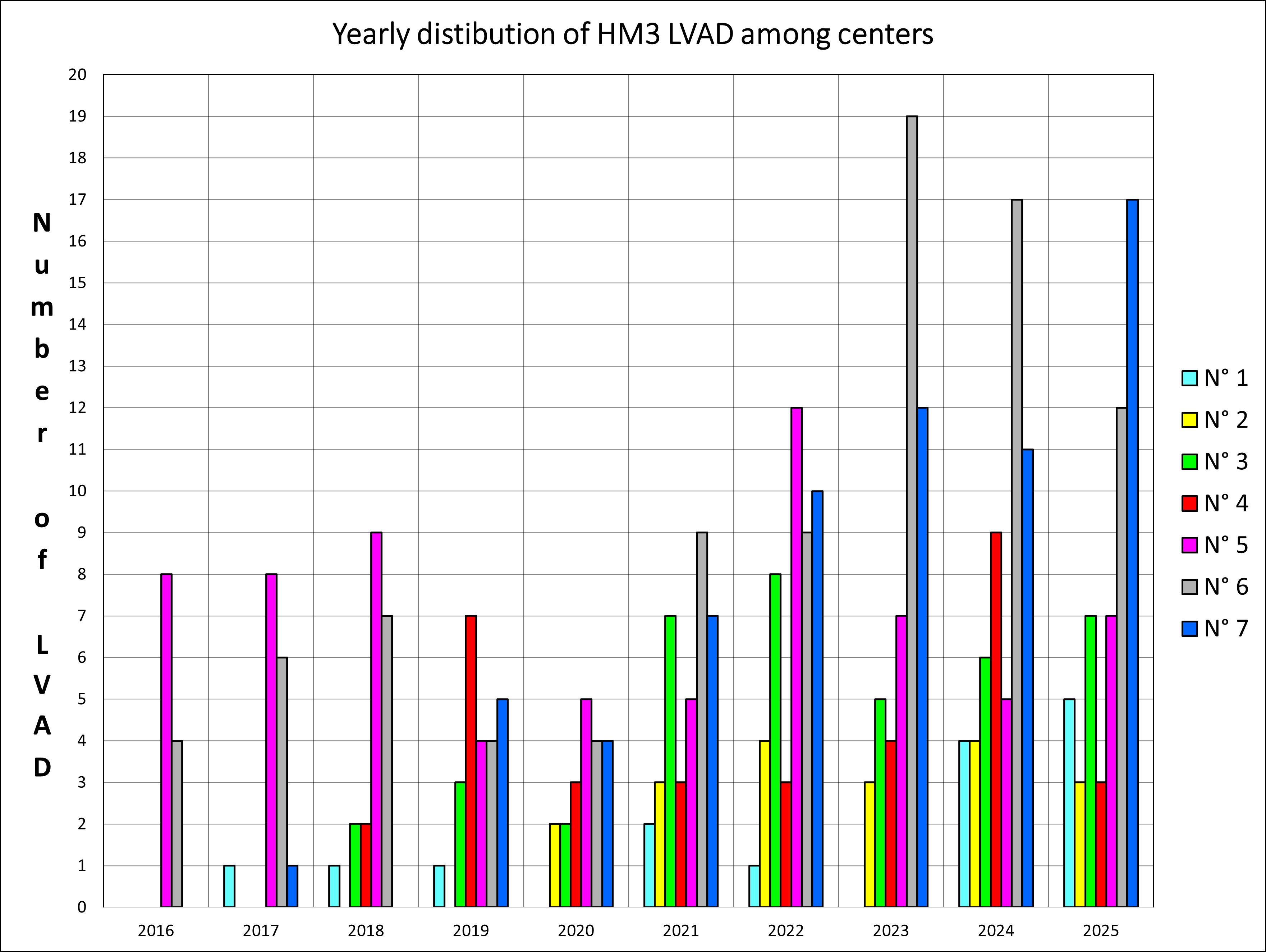 BACKGROUD: Research and expert consensus indicate that durable mechanical circulatory support ( d MCS) with Left Ventricular Assist Device (LVAD) therapy is significantly underestimated and underutilized in Italy compared to other European countries and North America. Our retrospective multicenter experience aims to describe the current state of art in HM3 LVAD activity, reporting real world and contemporary outcomes in complex cohoorts of patients treated by centers with both Heart Transplantation (HTX) and MCS facilities. METHODS: Seven italian centers reported their experience with HM3 LVAD implantation from 2016 to 2025. Out of 674 patients receiving a dMCS, 336 (49.9%) were HM3 (297 males, 39 females, mean age 59.2y). Three centers performed more then 60 implantations while 4 less/equal than 40. Yearly distribution is shown in fig. 1. Ischemic CMP was present in 173 pts vs. 136 with an idiopathic disease. Ninety-two pts (27.4%) were in INTERMACS Class I-II; of these, all had IABP, 20 were under VA-ECMO and 14 with mAFP Impella. 27 patients had a previous sternotomy. HM3 was implanted as BTT in 134 patients, BTC in 71 pts and DT in 131. Mean LV EF was 21.1%. 105 patients had severe pulmonary hypertension. RESULTS: Full sternotomy was perfomed in 330 cases. In 33 patients implantation occurred on arrested heart. Associated procedures were performed in 71 cases (21.1%), with 19 left appendage closure and 17 aortic valve replacements. 27 pts required a temporary RVAD; of these, 10 died (37%). Mean ICU stay was 17.6 days. Eighty-four patients needed CVVH. There were 65 rethoracotomy for bleeding. In -hospital mortality was 15.2%. Twelve, 24 and 60 months survival was 77.9, 66.6 and 41.2%. At FU, 54 pts underwent HTX. One-hundredheightyseven pts were re-admitted; 127 had a driveline infection while pump thrombosis was observed in 4 patients (4.2%). Freedom from Stroke and gastro-intestinal bleeding at 5 years were respectively 78.4% and 82.2% (fig. 2). CONCLUSIONS: Absolute numbers of HM3 LVAD implantation are still low in Italy with increasing trends in the last years. Despite a very compromised population, our multicenter experience shows excellent outcomes with low rates of major complications and a previously unimaginable medium-longterm survival. Due to the great reliability of th is unique available device , we advocate an expansion of knowledge about LVAD to i mplement nation a l r eferral and the number of implantations with the aim to bridge the gap.