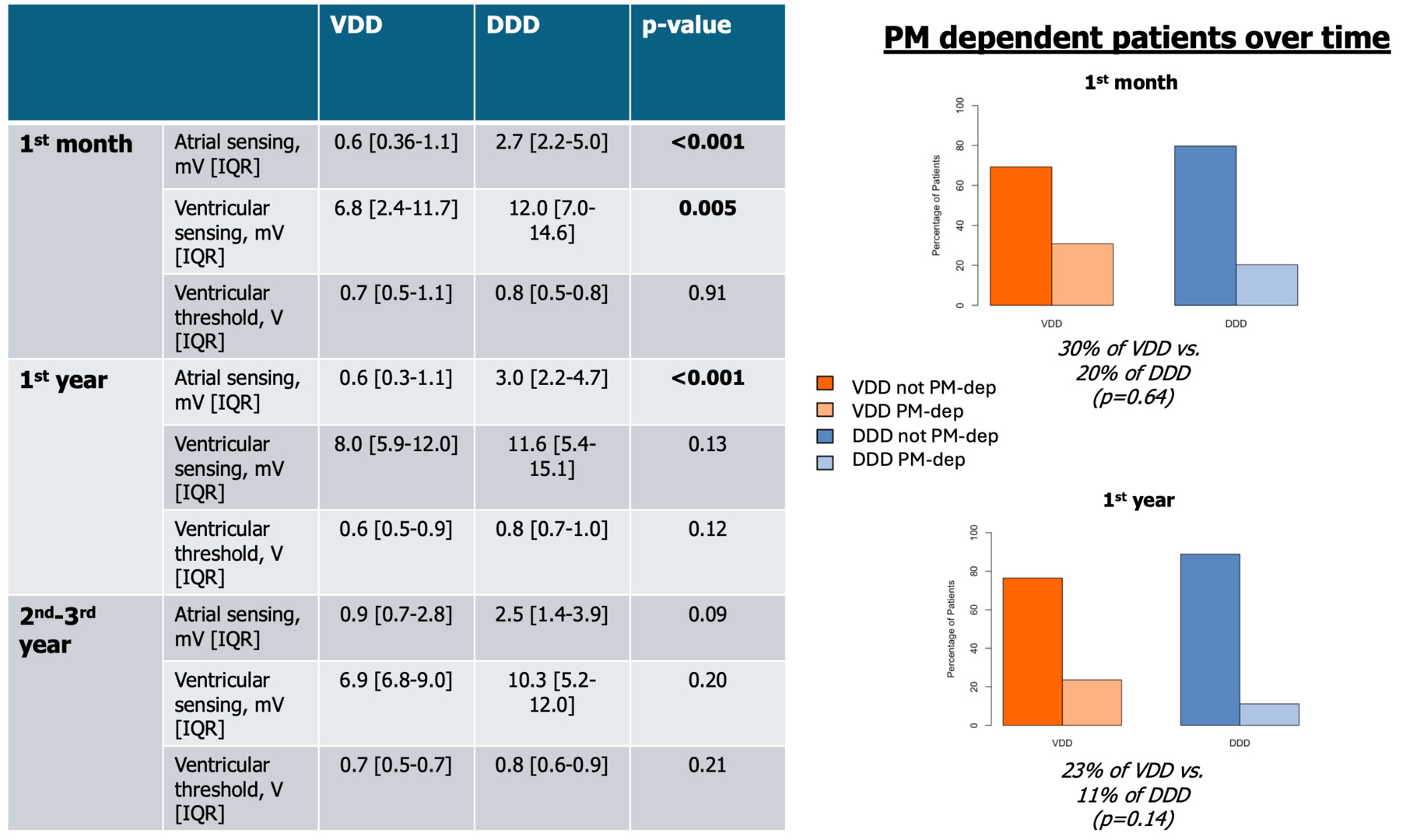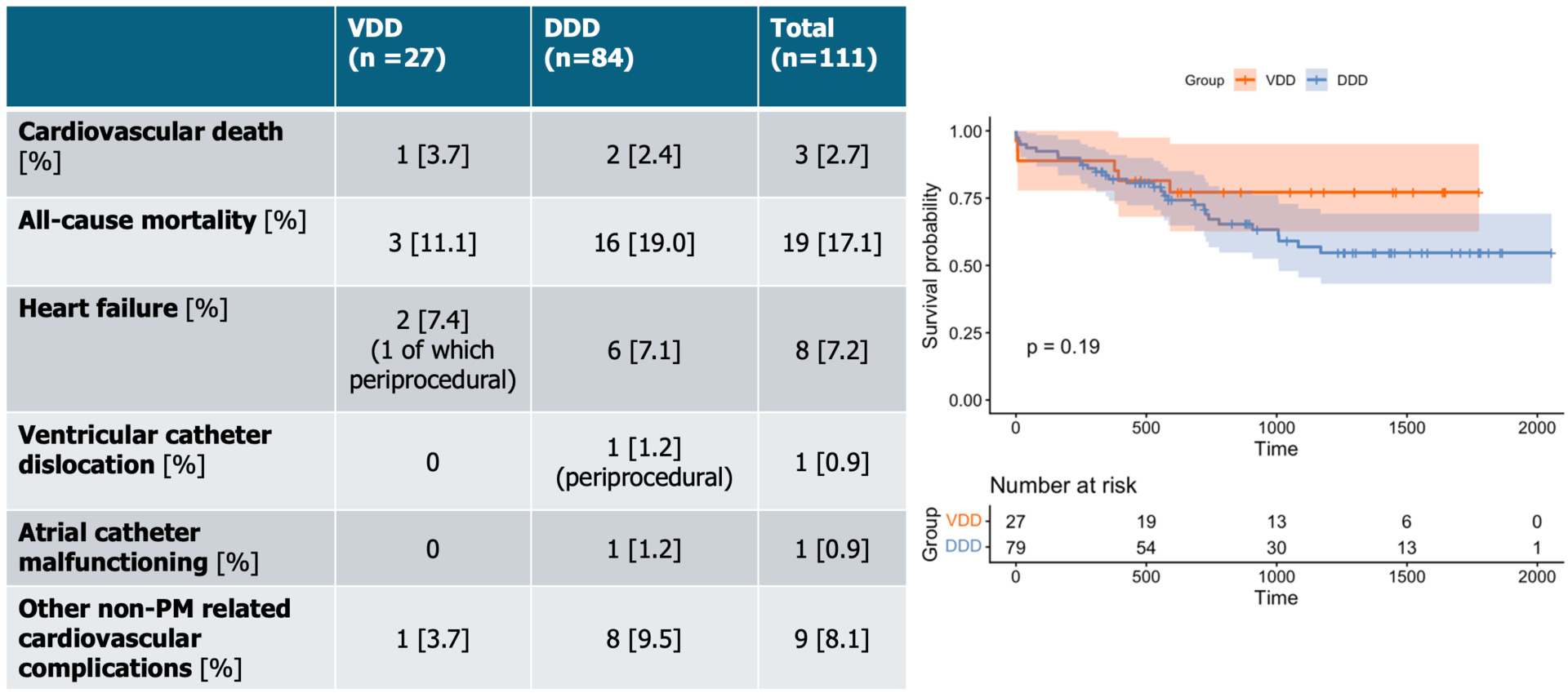 Background. Pacemaker implantation following transcatheter aortic valve replacement (TAVR) has been linked to increased mortality. Evidence on the efficacy and safety of single-lead atrioventricular sequential (VDD) pacing in this patient population is currently limited. Purpose. We sought to assess whether TAVR patients implanted with VDD had significantly different electrical parameters compared to TAVR patients implanted with dual lead pacemakers (DDD). Moreover, we investigated whether VDD pacing resulted in significantly different acute complications and long-term mortality rates than DDD pacing. Methods. We conducted a retrospective analysis on patients implanted either with a VDD or a DDD after TAVR. We compared PM procedural data and electrical parameters at 1 month, at 1 year and at 2-3 years. Acute complications were considered as procedure or device-related complications occurring up to 7 days after PM implant. Long-term mortality included both cardiovascular and all-cause mortality during the follow-up period. Results. 111 patients were included in the study, of which 27 VDD (24%) and 84 DDD (76%). All clinical characteristics were homogeneous between the two groups, except for VDD being significantly older than DDD (85.0 [interquartile range, 81.5-88.0] vs. DDD 82 [78.8-85.0] years, p=0.01). PM implantation was performed after a median of 1 [0-2] day following TAVR in VDD and a median of 2 [0-4] days in DDD. The implantation site of the VDD was apical-septal, whereas the implantation site of the DDD was septal. Implant duration was significantly shorter for VDD as compared to DDD (70.0 [60.5-82.5] vs. 85.0 [70.0-103.5] mins, respectively; p=0.02), as well as median fluoroscopy time (5.3 [3.9-6.9] vs. 9.8 [6.7-16.0] minutes; p<0.001). The electrical parameters during follow-up are summarized in Figure 1 . Median follow-up time in the whole cohort was 1120.0 [823.0-1302.0] days (VDD 1034.5 [895.3-1428.5] vs. DDD 1123.5 [796.3-1277.0] days; p=0.87). Mortality analysis was carried out on all VDD and 79 DDD (5 excluded due to missing data). There were no differences among groups regarding periprocedural complications and long-term mortality ( Figure 2 ). Notably, no VDD required upgrading with an atrial lead. Conclusions. In this retrospective, single-centre study, VDD pacemakers in post-TAVR patients had similar long-term electrical parameters, acute complications and long-term mortality compared to DDD, while requiring less procedure time.
