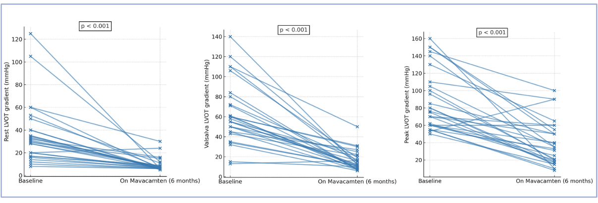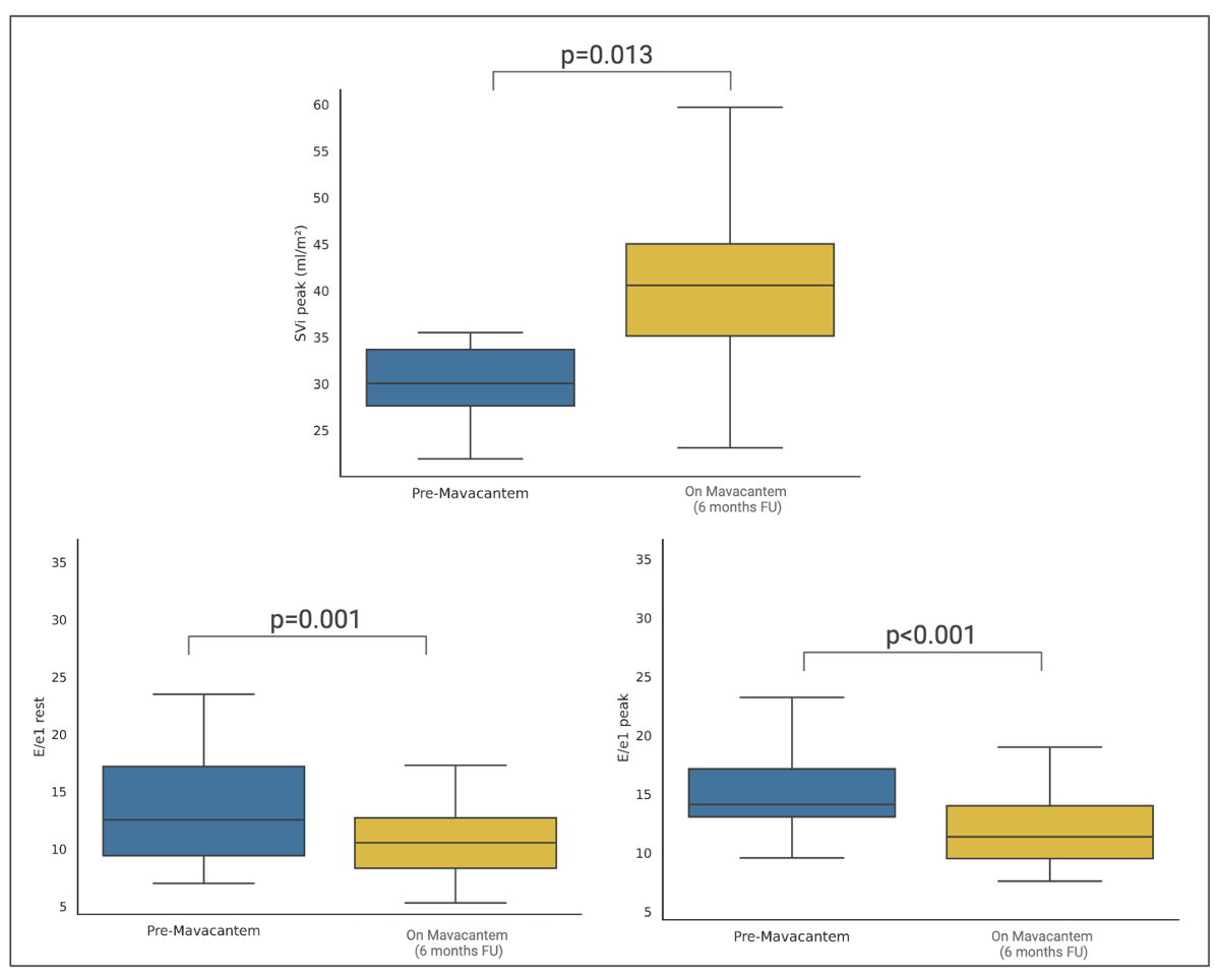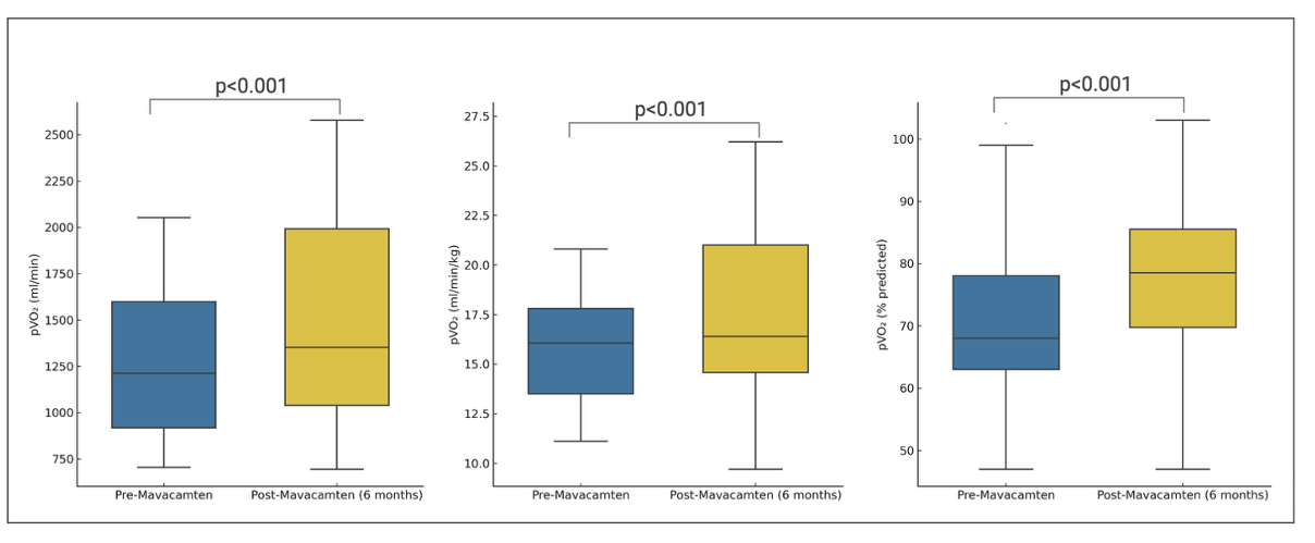 Background : Mavacamten, a selective cardiac myosin inhibitor, improves left ventricular outflow tract (LVOT) obstruction and symptoms in obstructive hypertrophic cardiomyopathy (HCM). However, real-world data integrating cardiopulmonary exercise testing (CPET) and echocardiography remain limited. Methods : In this prospective multicenter study, 28 patients with symptomatic obstructive HCM underwent transthoracic echocardiography and symptom-limited CPET at baseline and after 6 months of mavacamten therapy. The primary endpoint was the change in echocardiographic and CPET parameters. An exploratory secondary endpoint was the identification of baseline predictors of functional response, defined as a ≥5 percentage point increase in predicted peak oxygen consumption (%pred pVO₂). Results : After 6 months of treatment, resting LVOT gradient decreased from 30.5 [19.2–40.0] to 7.0 [6.0–8.2] mmHg (p = 0.001), and peak LVOT gradient from 75.5 [60.0–106.2] to 34.0 [17.8–51.2] mmHg (p = 0.001). Left atrial volume index and diastolic function indices significantly improved, with reductions in E/e′ at rest (12.6 [9.4–17.2] to 10.6 [8.3–12.7]; p=0.001) and at peak (14.1 [13.1–17.1] to 11.2 [9.3–13.8]; p = 0.001). Peak pVO₂ increased from 1213 [918–1598] to 1352 [1039–1992] ml/min (p= 0.001), pVO₂ ml/min/kg from 16.0 [13.5–17.8] to 16.4 [14.6–21.0] (p=0.004), and %pred pVO₂ from 68.0 [63.0–78.0] to 77.0 [69.5–86.0] (p=0.008). PETCO₂ at peak exercise increased (34.1 [31.2–35.6] to 35.4 [33.1–37.6]; p=0.002), and VE/VCO₂ slope decreased significantly (35.0 [32.7–37.0] to 31.6 [28.7–35.0]; p=0.007), indicating enhanced ventilatory efficiency. Overall, 46% of patients achieved a functional response (Δ%pred pVO₂ ≥+5). Lower baseline %pred pVO₂ (OR 0.58 [0.36–0.91]; p=0.021) and higher VE/VCO₂ slope (OR 1.56 [1.02–2.42]; p=0.041) independently predicted response, with fair model discrimination (AUC=0.73). Conclusions : Mavacamten significantly reduced LVOT gradients and improved diastolic, ventilatory, and functional parameters in obstructive HCM. Nearly half of patients experienced a clinically relevant improvement in exercise capacity, with baseline ventilatory inefficiency and lower aerobic performance identifying those most likely to benefit.
