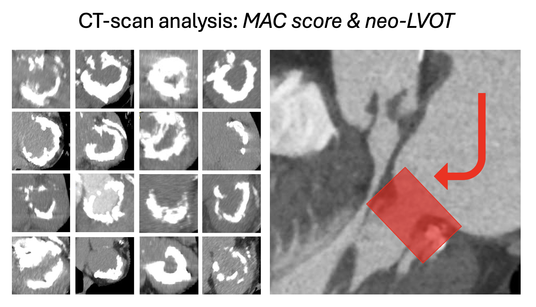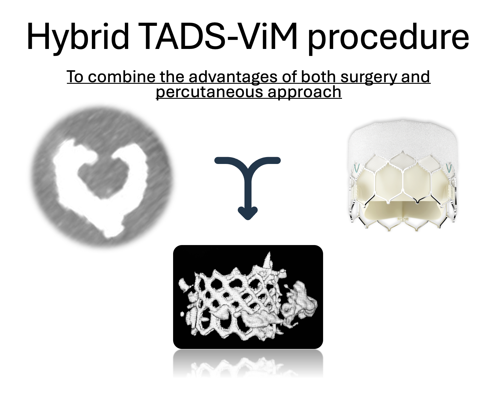 Background A clear standard for the treatment of mitral annular calcification (MAC) has yet to be established. Conventional surgical strategies continue to be associated with high mortality rates, whereas percutaneous Valve-in-MAC (ViM) procedures have shown promising results, although still limited by the risks of LVOT obstruction, embolization, and apical perforation. In recent years, several reports have described hybrid surgical “off-label” implantation of an aortic transcatheter heart valve (THV), proposed ad a way to mitigate these risks through more controlled device deployment. Here, we present our single-center experience of transatrial direct surgical Valve-in-MAC (TADS-ViM). Methods Between July 2022 and October 2024, n=16 patients affected by severe mitral valve steno-regurgitation underwent TADS-ViM. A mini-thoractotomy access was performed in one subject. On CPB, the anterior leaflet was removed and single- or bi-commissural sutures were applied in all cases to reduce valve area and circularize the annulus. After pre-dilatation, a SAPIEN 3 Ultra THV was inflated ~30/70% atrio-ventricular, commissurally aligned. Four-to-nine single atrial U-stitches were placed to avoid embolization. An eventual post-dilatation was performed to improve stent frame expansion after knot tying. Results Procedural success rate was 100%. CT-scan analyses confirmed severe MAC (score: 8.5 [7,9]; area: 607±97 mm2, predicted neo-LVOT: 205 [165, 283] mm2, n=2 complete obstruction). Median clamp time was 89 [68, 125] min. A 26 and 29 mm devices were implanted in n=5 and n=11 patients, respectively. 50% of the patients underwent concomitant procedures (n=6 AVR; n=4 CABG; n=2 aortic surgery). No cases of LVOT obstruction were reported, but one patient required revision for major bleeding due to apex lesion during balloon inflation. 30-day mortality rate was 18.8% (n=3), mainly due to sepsis. At a median follow-up of 1 year, survival rate was 75% (n=12). One patient required percutaneous closure of bi-commissural leaks at 2.5 years. Conclusions TADS-ViM may represent a valid alternative to complex surgical decalcification strategies or challenging ViMAC procedures. Concomitant targets may also be surgically addressed and small anatomies -not amenable of percutaneous approach- treated as well. However, mortality rate of these fragile and comorbid patients remains high. The implementation of less invasive and durable solutions to treat MAC is mandatory.