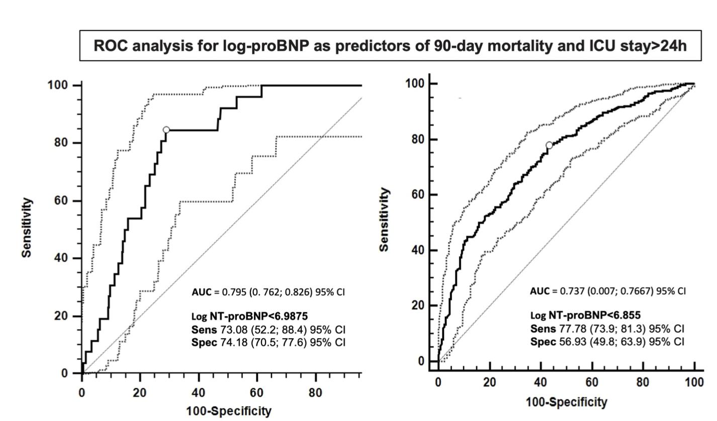 Background NT-proBNP is widely recognized as a prognostic marker in congestive heart failure. However evidence regarding its role in patients with valvular heart disease, particularly in those undergoing cardiac surgery, remains limited. Objective To analyze the association between NT-proBNP levels and mortality and peri-operative outcome in patients undergoing mitral valve surgery. Methods NT-proBNP levels were measured before, at five days, at three months and during follow-up after surgery in patients from 2020 to 2025. Primary endpoint was the prognostic value of NT-proBNP on 90-day mortality. Secondary outcomes included major post-operative complications and length of stay. Associations were assessed using univariate and stepwise multivariate logistic regression analysis. Due to their skewed distribution, NT-proBNP values were logarithmically transformed. Values that best discriminated patients outcome were identified by evaluating the ROC curves: the selected cutoff was the one that maximized sensitivity and specificity (Youden index). The statistical significance level was set at p<0.05. Statistical analysis was performed using SAS® 9.4 software (SAS Institute Inc, Cary N.C. USA). Results 797 patients were enrolled, with a mean age of 67 years; 361 patients (45.3%) were female and 137 (17.2%) had previous cardiac surgery. In-hospital and 90-day mortality rates were 1.6% e 3.5%, respectively. Stroke rate was 1.3%, acute kidney injury was 7% and LCOS 1.8%. Median ICU and in-hospital length of stay were 1 and 7 days, respectively. At univariate analysis, NT-proBNP was significantly associated with 90-day mortality (OR 1.906, 95% CI 1.456-2.495), ICU stay > 24 hours (OR 1.821, 95% CI 1.602- 2.071) and LCOS (OR 1.620, 95% CI 1.149-2.283). ROC curve analysis identified a logNTproBNP level of 6.99 as the threshold with the best discriminative ability for 90-day mortality, and a level of 6.86 for an ICU length of stay > 24 hours. In the multivariable model, independent predictors of 90-day mortality included NT-proBNP levels (OR 1.674, 95% CI 1.230-2.277), age (OR 1.080, 95% CI 1.020-1.143) and cardiopulmonary bypass time (OR 1.016, 95% CI 1.008-1.025). After adjustment for the selected covariates, NT-proBNP remained significant. Conclusions NT-proBNP is an important independent predictor for peri-operative outcomes and early mortality in patients undergoing mitral valve surgery, supporting its potential role in pre-operative risk stratification.