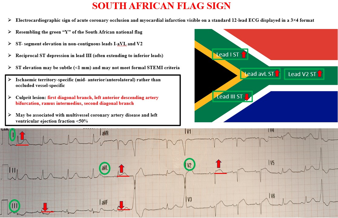 Background The South African flag sign (SAFS) is an electrocardiographic (ECG) pattern described by Littmann in 2015 for educational purposes. It is characterised by ST-segment elevation in leads I-aVL and the non-contiguous precordial lead V2, with reciprocal depression in lead III -avF, recreating the Y-shaped green element of the South African flag. Traditionally linked to first diagonal (D1) occlusion it is an increasingly recognized pattern of occlusion myocardial infarction, often not fulfilling classical ST- elevation myocardial infarction (STEMI) criteria. No specific review on this ECG sign has been conducted to date. Methods We systematically searched PubMed, MEDLINE, EMBASE, Scopus, Google scholar and grey literature, including reference list screening (2015–December 2025), to identify case reports and small series describing SAFS in acute coronary syndromes. Demographics,clinical, echocardiographic and ECG features, culprit vessel, left ventricular function, treatment and outcomes were extracted. Results Most cases were reported in 2025. We identified 21 reports describing 24 patients with SAFS, nearly all of whom underwent coronary angiography. Chest pain was universally present. Patients were diagnosed based on SAFS rather than classical STEMI criteria, reflecting the absence of guideline-specific recommendations.The culprit vessel was D1 or left anterior descending artery (LAD) bifurcation lesion in most cases, but ramus intermedius, multivessel disease, second diagonal branch of LAD, coronary aneurysms or no critical stenosis were also reported. Nearly all patients underwent urgent angioplasty with favourable in-hospital outcomes. Left ventricular ejection fraction was frequently <50%. No deaths occurred. Conclusions Available evidence indicates that SAFS is an under-recognised marker of acute transmural occlusion myocardial infarction, often not classified as STEMI because ST elevation can be subtle and appears in non-contiguous leads. The ECG pattern localises the ischaemic territory rather than a single culprit vessel and is consistent with transmural ischaemia arising from multiple potential occlusions rather than exclusively D1. Prompt identification of SAFS should trigger immediate coronary angiography and revascularisation. Given its diagnostic and prognostic relevance, this pattern merits formal inclusion in acute coronary syndrome guideline.