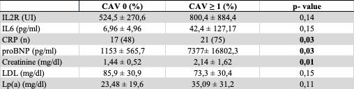 Background: Cardiac allograft vasculopathy(CAV) is the most common form of late rejection after heart transplantation.Early detection and monitoring of CAV are crucial for improving long-term outcomes.Aim of this work is to investigate pros/cons of each imaging modality and the potential of selected non-invasive biomarkers in predicting the presence and severity of CAV. Methods: We retrospectively analyzed clinical reports and angiographies of 63 living patients transplanted in Ospedale Monaldi. Levels of NT-proBNP, creatinine, LDL,Lp(a),IL-2R, IL-6, C-Reactive protein were statistically analyzed. Results: sample was stratified as follows:56% CAV0, 9% CAV1, 11% CAV2 and 24% CAV3 disease. IVUS(n=29)resulted positive in 67% cases of CAV0group, identifying a pre-clinical stage of disease.OCT(n=2)resulted positive in both patients, showing in one case a fibrotic infiltration of the vessel wall, diffusely involving the entire analyzed segment(Figure1A), and in the second case lipid accumulation at multiple sites along the vessel(Figure1B). Results about biomarkers are summarized in Figure2.CRP,NT-proBNP, and serum creatinine were significantly correlated with angiographically confirmed CAV(Figure3),whereas IL-2R and IL-6 showed a trend toward higher values in the CAV group. No statistically significant difference was found in mean LDLand Lp(a) levels between CAV0 and CAV-positive patients.No difference was found for all the aforementioned parameters between IVUS-pos and IVUS-neg patients. Discussion :the main findings of our study are the following:1)Intravascular imaging currently remains the sole system for preclinical diagnosis of the disease;while IVUS discriminates the presence of disease, OCT can reveal different disease phenotypes;2)CRP showed a statistically significant correlation with disease presence,while IL-2R and IL-6 exhibited an increasing trend with disease severity, confirming the role of inflammation in the development of CAV;3)no statistically significant differences were found for LDL or Lp(a) levels between groups, which underscores that CAV is not purely an atherosclerotic process;4)higher creatinine and NT-proBNP levels may reflect allograft dysfunction or ongoing vascular pathology in CAV patients. Conclusions :This study highlights the potential clinical value of inflammation, renal dysfunction and myocardial stress biomarkers in CAV patients, and advocate for an expanded use of intravascular imaging, especially OCT, for early CAV detection.