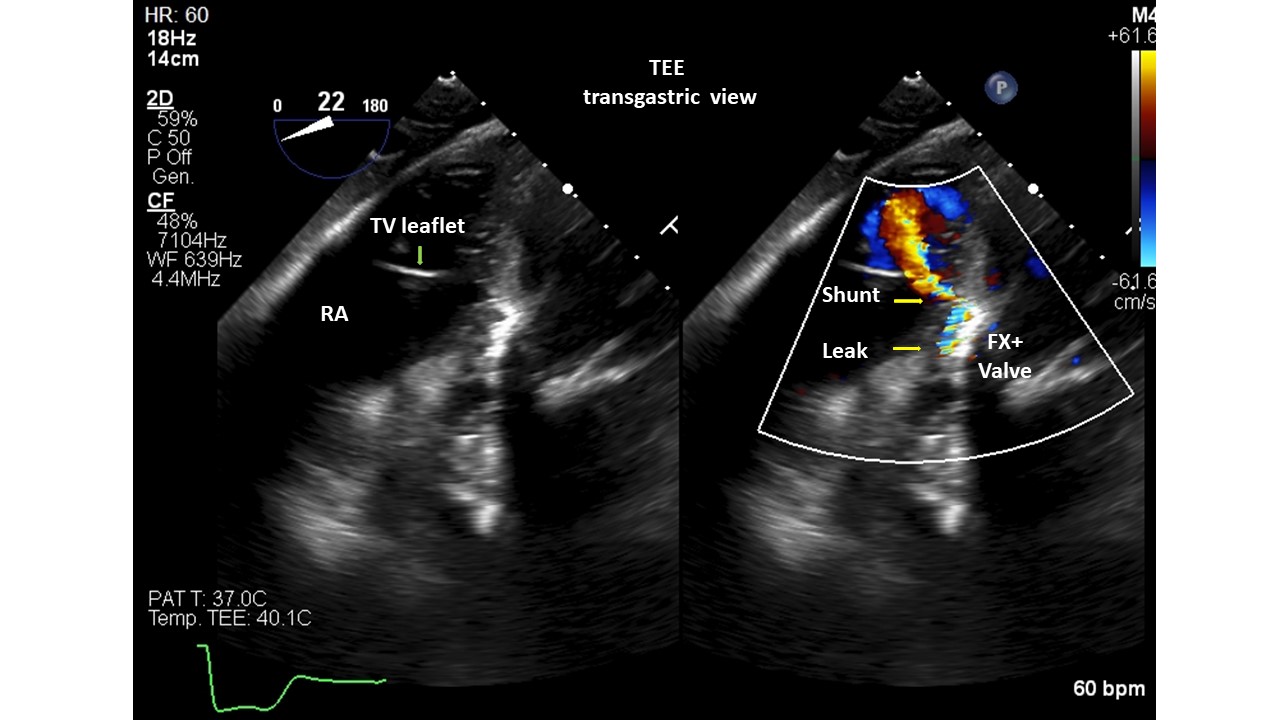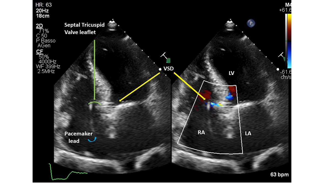 Introduction. Gerbode’s defect dates back to 1857. It generally has a congenital etiology, however very rare acquired forms have been described as complications of cardiac surgery, bacterial endocarditis, thoracic trauma, myocardial infarction or Transcatheter Aortic Valve Implant (TAVI). Diagnosing the communication between the left ventricle and the right atrium post-TAVI is not always easy, but a thorough echocardiography can lead to the correct diagnosis. We present 2 patients with Gerbode's defects post-TAVI, presumed with post-procedural transthoracic echocardiography (TTE) and validated with transesophageal (TEE) or 3D-ultrasound (3DTTE). Methods. A single-centre retrospective study of 1309 consecutive with severe aortic stenosis patients, who underwent TAVI from 2020 to 2025, was conducted with 5 types of aortic valve. All patients were evaluated with TTE before and after the procedure; only 23 patients underwent TEE. Results. Screened patients had a mean age of 82±7 years. Patients had multiple cardiac and non-cardiac comorbidities and high logistic EuroSCOREs and STS scores. Two subjects (0.15%) were found to have a Gerbode-type II septal defect. They were implanted with Medtronic Evolut FX+ valve. The calcium score of the aortic valve annulus was calculated in the 2 patients with CT (3,296 and 2,395 AU, respectively). Both prostheses were postdilated with a balloon to treat residual moderate paravalvular regurgitation. The cases were diagnosed with TEE/3DTTE to have a restrictive left to right shunt (Qp:Qs=1.4 case 1, 1.2 case 2). The patients were not symptomatic and did not require any further intervention. The mechanisms proposed for ventricular septal defect (VSD) formation: pressure exerted directly by the valve on the membranous septum, severe/asymmetric calcification of native valve, aggressive postdilatation. Conclusions. The role of TEE/3DTTE in the accurate diagnosis of these VSD suggests that it can be used as an alternative to other diagnostic tools, such as cardiac catheterization, CT and cardiac magnetic resonance imaging. Gerbode’s defect is a rare complication of TAVI and was detected more with balloon expandable valves, but can also occur with self-expanding ones. Percutaneous treatment was preferred over open cardiac surgery. Some, but not all, patients survived TAVI and VSD, and had a good prognosis for both patient groups with or without VSD closure. Careful follow-up with a dedicated team is essential in these patients.