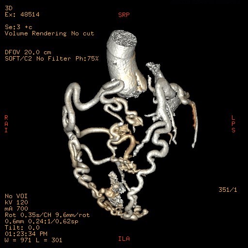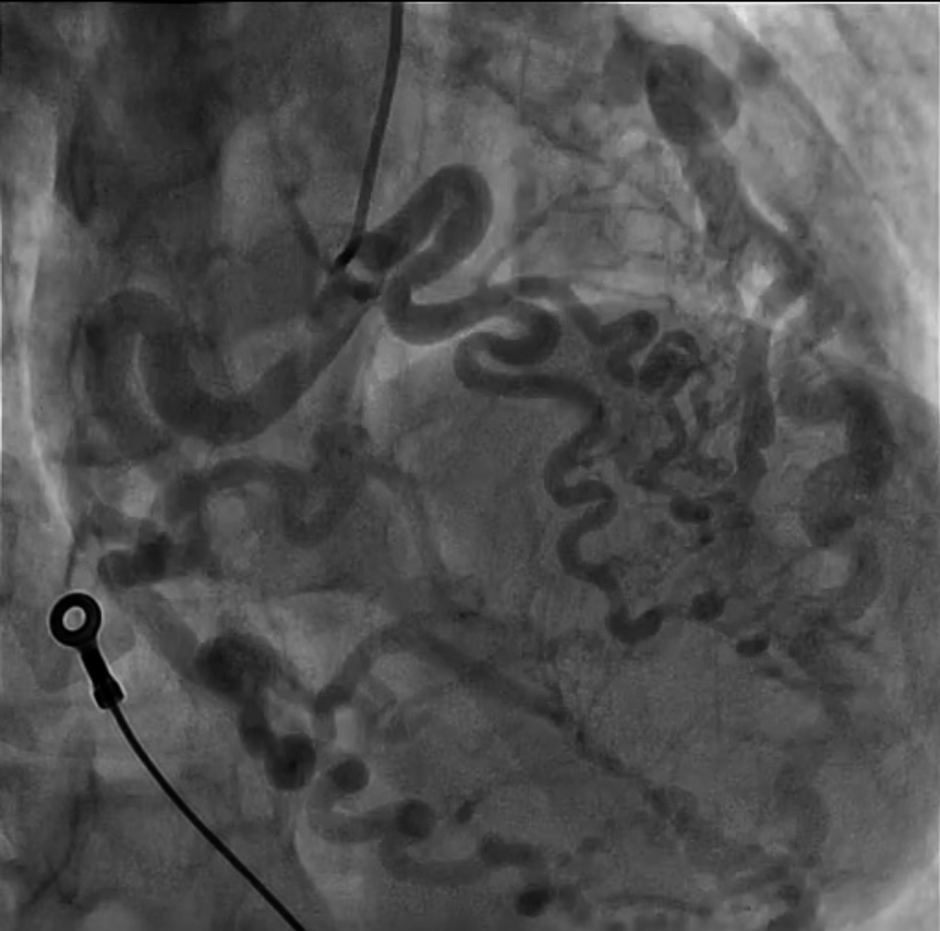 Background Out-of-hospital cardiac arrest is a major cause of mortality, most commonly related to ischemic heart disease. Rare congenital coronary anomalies may represent an uncommon but potentially lethal substrate for malignant ventricular arrhythmias. Case Presentation A 42-year-old woman with no known cardiovascular history was found unconscious in an out-of-hospital setting. On arrival of Emergency Medical Services, she was in cardiac arrest due to ventricular fibrillation. Electrical defibrillation restored spontaneous circulation(ROSC). Post-ROSC EKG showed a new-onset left bundle branch block. Urgent coronary angiography revealed a complex congenital coronary anomaly characterized by absence of the left main coronary artery and a single coronary artery arising from the right coronary sinus. The vessel appeared markedly ectatic and tortuous, giving rise to both the left anterior descending(LAD) and circumflex(LCx) arteries, without angiographically significant stenoses. Multiple coronary arteriovenous fistulas draining into the pulmonary artery and involving septal branches were also observed ( Image 1A ). Coronary CT confirmed the absence of the left main coronary artery and demonstrated a single ectatic coronary artery (up to 7 mm) originating from the right coronary sinus, with a highly tortuous course and formation of a vascular network at the cardiac apex. Retrograde filling of a dilated LAD and origin of a dilated LCx (7–8 mm) were observed ( Image 1B-C ). Multiple fistulous connections with hypertrophic bronchial arteries were present. A right-sided pneumothorax and pneumomediastinum were also detected and successfully treated with chest drainage. After a few days in the intensive care unit, the patient was weaned from mechanical ventilation with complete neurological recovery. Initial transthoracic echocardiography showed severe left ventricular systolic dysfunction (LVEF 30–35%), which improved to 60% during hospitalization. Given the occurrence of ventricular fibrillation in the absence of a reversible ischemic cause, a dual-chamber implantable cardioverter-defibrillator was implanted for secondary prevention. At discharge, the patient was prescribed only a beta-blocker. Conclusion This case highlights a rare presentation of complex congenital coronary artery anomaly with extensive coronary fistulization leading to sudden cardiac arrest. Advanced imaging and multidisciplinary management were essential for diagnosis and favorable outcome.