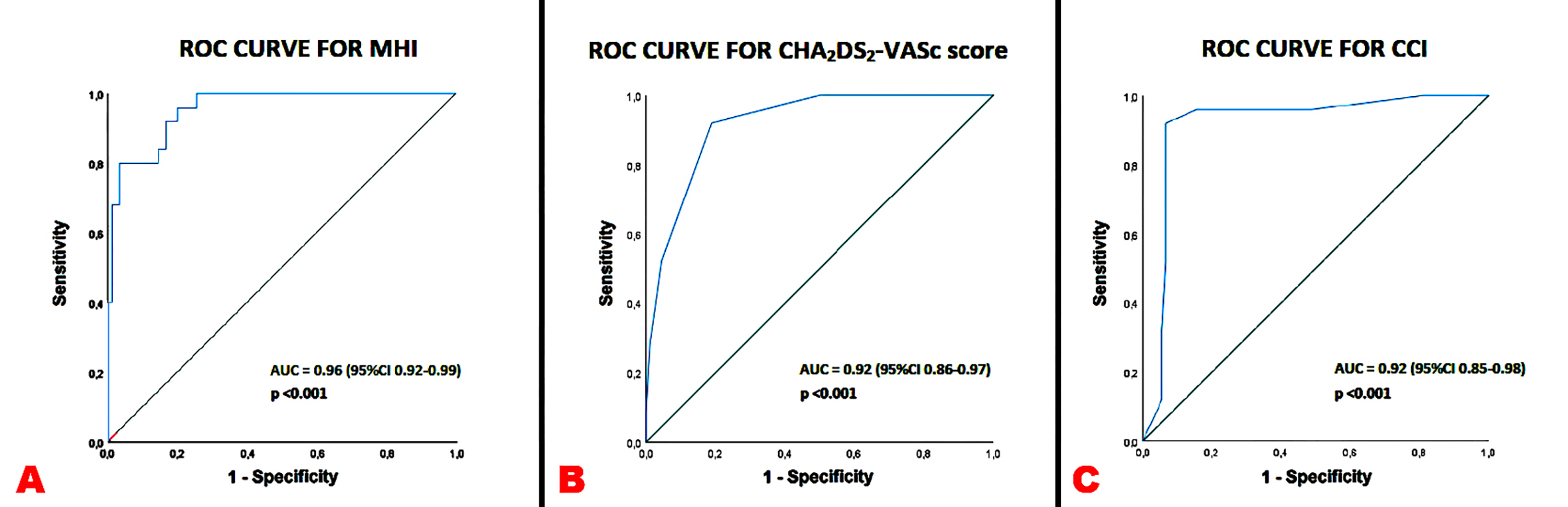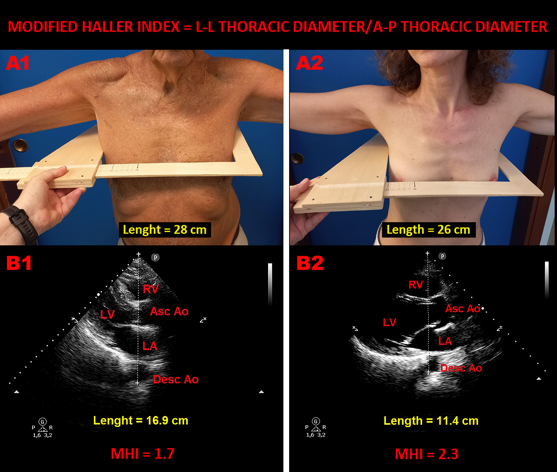 Background: No previous study evaluated the possible influence of chest wall conformation on symptoms perception in atrial fibrillation (AF) patients candidates for electrical cardioversion (ECV). We aimed at evaluating the anthropometric and clinical characteristics of patients with persistent AF undergoing ECV, categorized according to the presence or absence of symptoms. Methods: This study retrospectively analyzed a series of persistent AF patients scheduled for early ECV who underwent pre-procedural clinical evaluation, MHI (the ratio of chest transverse diameter over the distance between sternum and spine) assessment, transthoracic and transesophageal echocardiography implemented with strain analysis of both left atrium and left atrial appendage. Thromboembolic risk and burden of comorbidities were assessed by CHA 2 DS 2 -VASc Score and Charlson comorbidity index (CCI), respectively. The independent predictors of “asymptomatic AF” were assessed. Results: A total of 25 asymptomatic and 90 symptomatic AF patients were retrospectively examined. Compared to symptomatic AF patients, those asymptomatic were significantly older (78.4±3.8 vs 71.0±7.7 yrs, P <0.001), predominantly males (84 vs 44.4%, P <0.001), with significantly lower MHI (2.0±0.1 vs 2.4±0.1, P <0.001), higher CHA 2 DS 2 -VASc Score (5.8±1.1 vs 3.6±1.1, P <0.001) and CCI (6.8±1.4 vs 2.3±0.9, P <0.001), and greater impairment in biventricular systolic function and atrio-auricolar myocardial strain indices. On multivariate logistic regression analysis, CHA 2 DS 2 -VASc Score (OR 2.65, 95%CI 1.53-4.60) and CCI (OR 2.36, 95%CI 1.16-4.66) were linearly associated with the endpoint “asymptomatic AF”, whereas MHI (OR 0.76, 95%CI 0.59-0.97) was inversely associated with the asymptomatic status. A MHI <2.2 was the best cut-off for detecting asymptomatic AF patients. Conclusions: MHI is inversely associated with asymptomatic status in persistent AF patients undergoing ECV. MHI assessment might represent an innovative practical approach to AF patients. Figure 1. Examples of MHI (L-L/A-P thoracic diameter) assessment in an asymptomatic elderly male affected by persistent AF (Panels A1 and B1) and in a symptomatic younger AF woman (Panels A2 and B2), included in the present study. Figure 2. ROC curve analysis performed to determine the best cut-off of MHI (Panel A), CHA 2 DS 2 -VASc Score (Panel B) and CCI (Panel C) for predicting the endpoint “asymptomatic AF” in the whole study group.