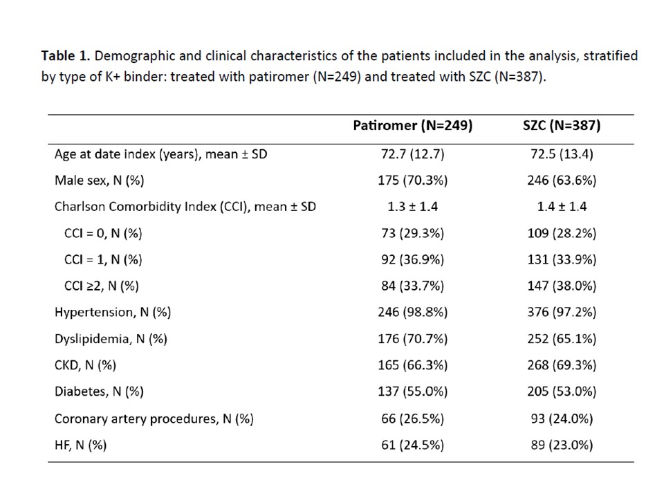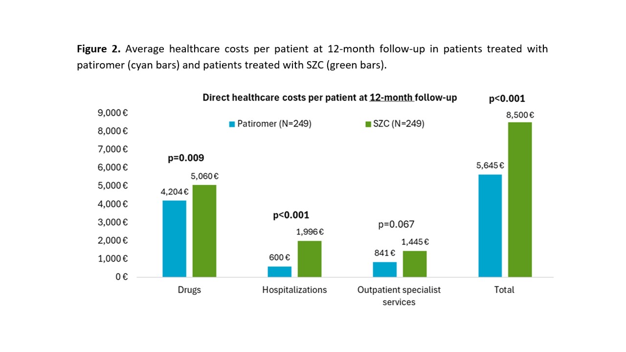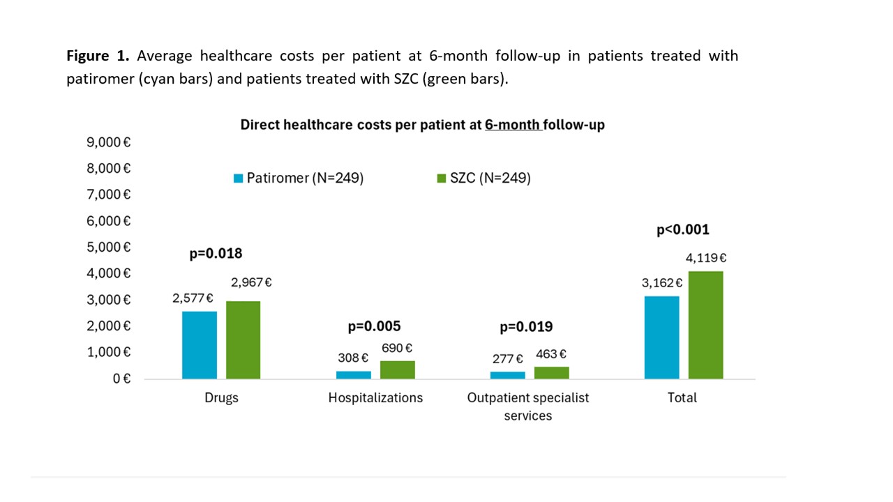 Hyperkalemia is common in patients with chronic kidney disease (CKD) and heart failure (HF), often affecting prognosis and treatment continuity with renin–angiotensin–aldosterone system inhibitors (RAASi). Potassium (K⁺) binders allow control of K + serum levels and maintenance of RAASi therapy at proper dosage. Given the scarcity of real-world data in Italy, this analysis focused on patients treated with different K⁺ binders, assessing the consistency with data from the US setting, where outcome differences in favor of non–sodium-exchange binders have emerged. From administrative databases of Italian healthcare bodies (~6 million beneficiaries), adults with ≥1 prescription of patiromer or sodium zirconium cyclosilicate (SZC) between Jan-2022 and Jun-2024 were selected. Patients on dialysis, transplant recipients, those treated with ≥1 K⁺ binder or with <6 months of follow-up from the first K⁺ binder prescription were excluded. Demographic and clinical characteristics, treatment adherence at 6 months—estimated using the Medication Possession Ratio (MPR: treatment duration/observation time)—and costs were described. Clinical outcomes were assessed after matching (by age, sex, comorbidities, and co-medications) at 6 months and over the entire observation period (10.7 months for patiromer; 7.5 months for SZC). Among the 636 included patients treated with patiromer (N=249) or SZC (N=387), the mean age was nearly 73 years, with male predominance. The most common comorbidities were hypertension, hyperlipidemia, CKD, diabetes, and HF (Table 1). During the first 6 months of follow-up, the proportion of adherent patients (MPR ≥80%) was significantly higher in patiromer than in SZC users (67.5% vs 20.4%; p<0.001), a finding confirmed over the entire period (42.5% vs 13.4%; p<0.001). After matching, the rate of HF-related hospitalizations was lower with patiromer compared with SZC, both at 6 months (5.4 vs 12.8 events per 100 patient-years) and over the entire follow-up (5.3 vs 15.7). Mean per-patient costs were lower with patiromer at 6 months (€3,162 vs €4,119) and at 12 months (€5,645 vs €8,500), mainly due to reduced hospitalization costs (Figures 1-2). Considering pharmaceutical expenses, patiromer users had lower costs for anti-anemic and antidiabetic drugs. In Italian clinical practice, patiromer treatment led to reduced HF hospitalization risk and healthcare costs compared with SZC, supporting its use in hyperkalemia management for patients with CKD and HF.