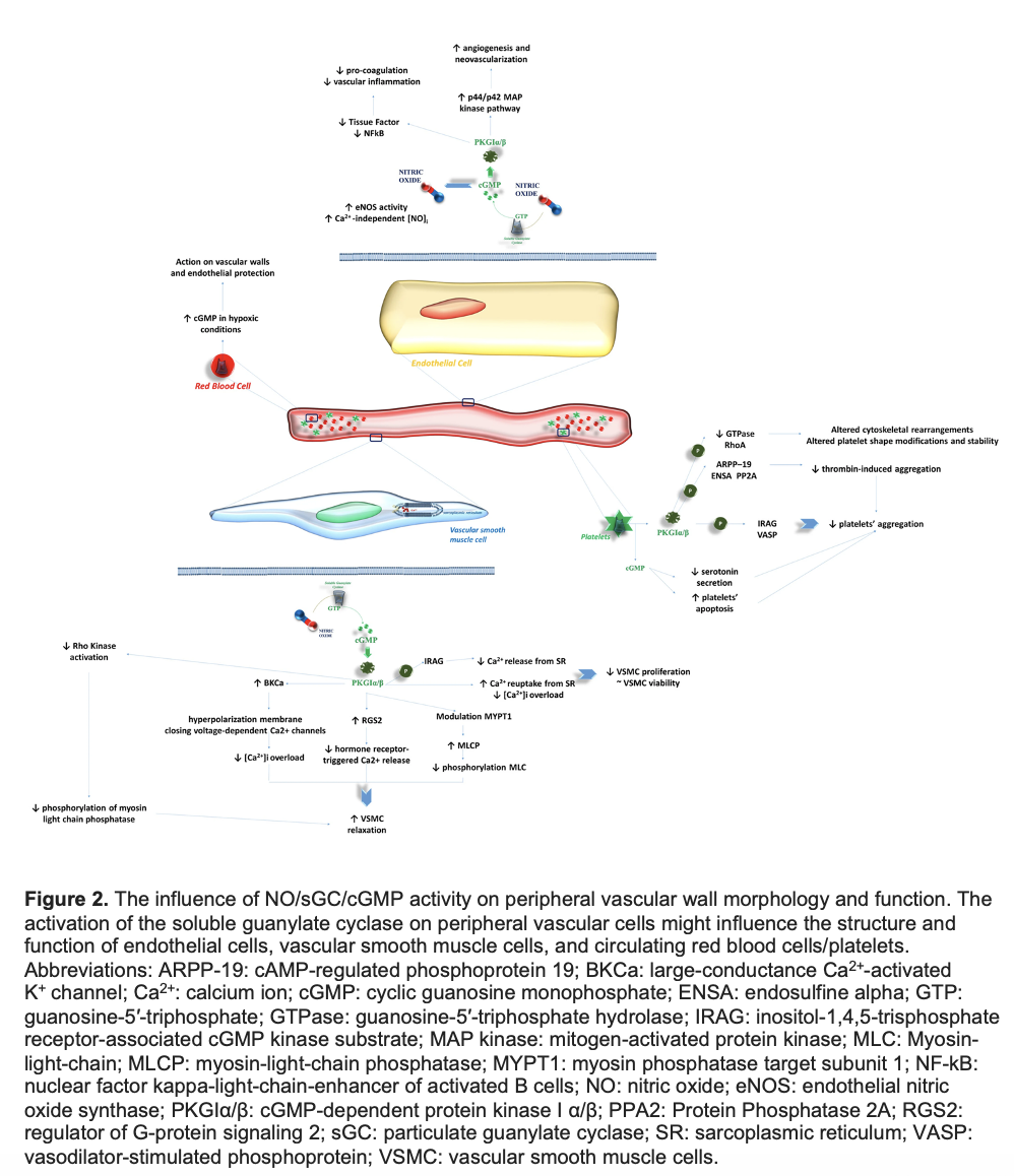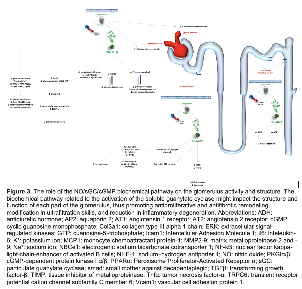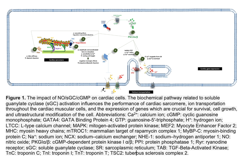 The role of nitric oxide (NO), soluble guanylate cyclase (sGC), and the cyclic guanosine monophosphate (cGMP) pathway in cardiovascular and renal health and disease is a complex issue. The impact of these biochemical pathways on the vascular tree is well established: the activation of sGC by NO promotes vasodilation and modulates vascular tone. Indeed, additional characteristics exist that lead physicians to believe there is a pleiotropic influence of this pathway on the functional activities and structural characteristics of human tissues and cells. Recently, sGC stimulators have demonstrated clinical efficacy in patients with worsening heart failure with reduced ejection fraction, improving cardiovascular death risk, re-hospitalization for HF, and all-cause mortality. These new outcome data have increased interest in understanding the potential pathophysiological mechanisms. The NO-sGC-cGMP axis may influence endothelial function, kidney performance, and cardiac muscle cell activity. The synergy of these actions could explain the positive effects of vericiguat on worsening HF. The aim of this narrative review was to provide a comprehensive insight into the pathophysiological mechanisms of action of NO-sGC-cGMP axis stimulators on cardiac muscle, endothelial cells, and kidneys.